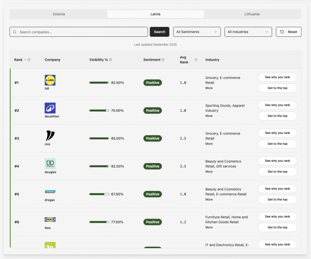 To help brands understand their current standing and what’s possible, we launched the first AI Search Visibility Leaderboard for the Baltic region.
