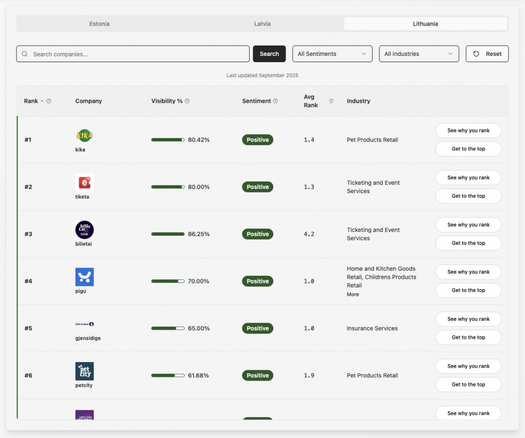 In Lithuania, the AnswerRank leaderboard reveals a strong showing from local and regional champions, many of which outperform global players in AI visibility. The top three brands include pet supply chain Kika (80.42%), ticketing service Tiketa (80%), and Bilietai.